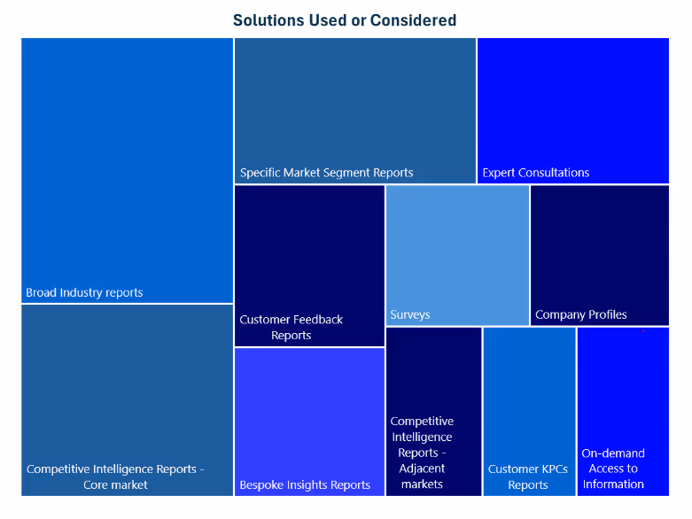 The most frequent solutions that top management professionals in corporations currently use or would consider using in order to achieve their strategic goals include Reports -Broad Industry, for Competitive Intelligence, or for particular segments of their market-, and Expert Consultations (through Information Services firms) to gain access to domain knowledge and expertise.