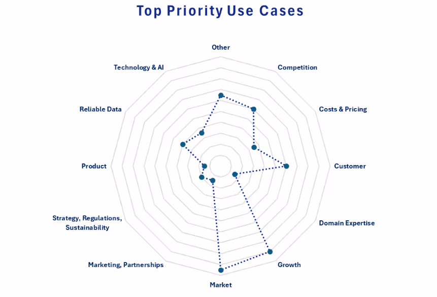 When survey participants were asked about the potential applications they might have for Information & Research services, there was a mosaic of answers. Respondents were mostly interested in insights on the Market, the Customer, or the Organization. Other applications were related to Product and Innovation or Growth, with other popular answers being Technology & AI implementation and Costs & Pricing.