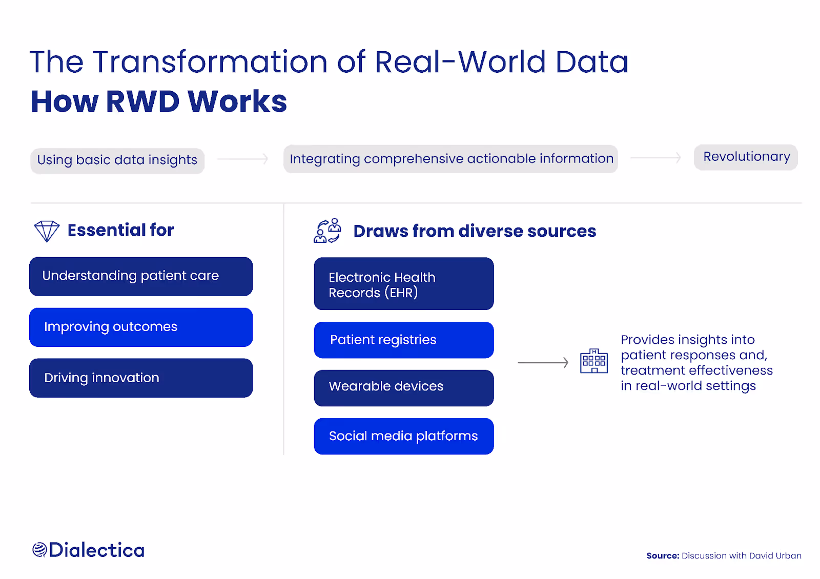 In its current state, RWD draws from diverse sources, including electronic health records (EHRs), patient registries, wearable devices, and even social media platforms. These data points provide insights into patient responses and treatment effectiveness in real-world settings, outside the controlled environment of clinical trials. “We’re pulling in data from mobile devices, claims, and billing records – essentially any source that helps us paint a clearer picture of how patients respond to treatments in real life”, Urban explained.