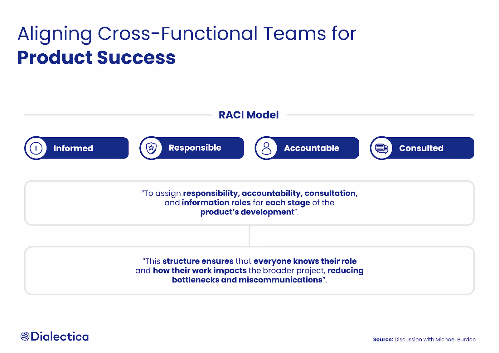 Burdon also uses the Responsible, Accountable, Consulted, and Informed (RACI) model to assign responsibility, accountability, consultation, and information roles for each stage of the product’s development. This structure ensures that everyone knows their role and how their work impacts the broader project, reducing bottlenecks and miscommunications. Stage-gate meetings and steering committees provide further oversight, ensuring that key decision-makers are involved at critical points in the development process.
