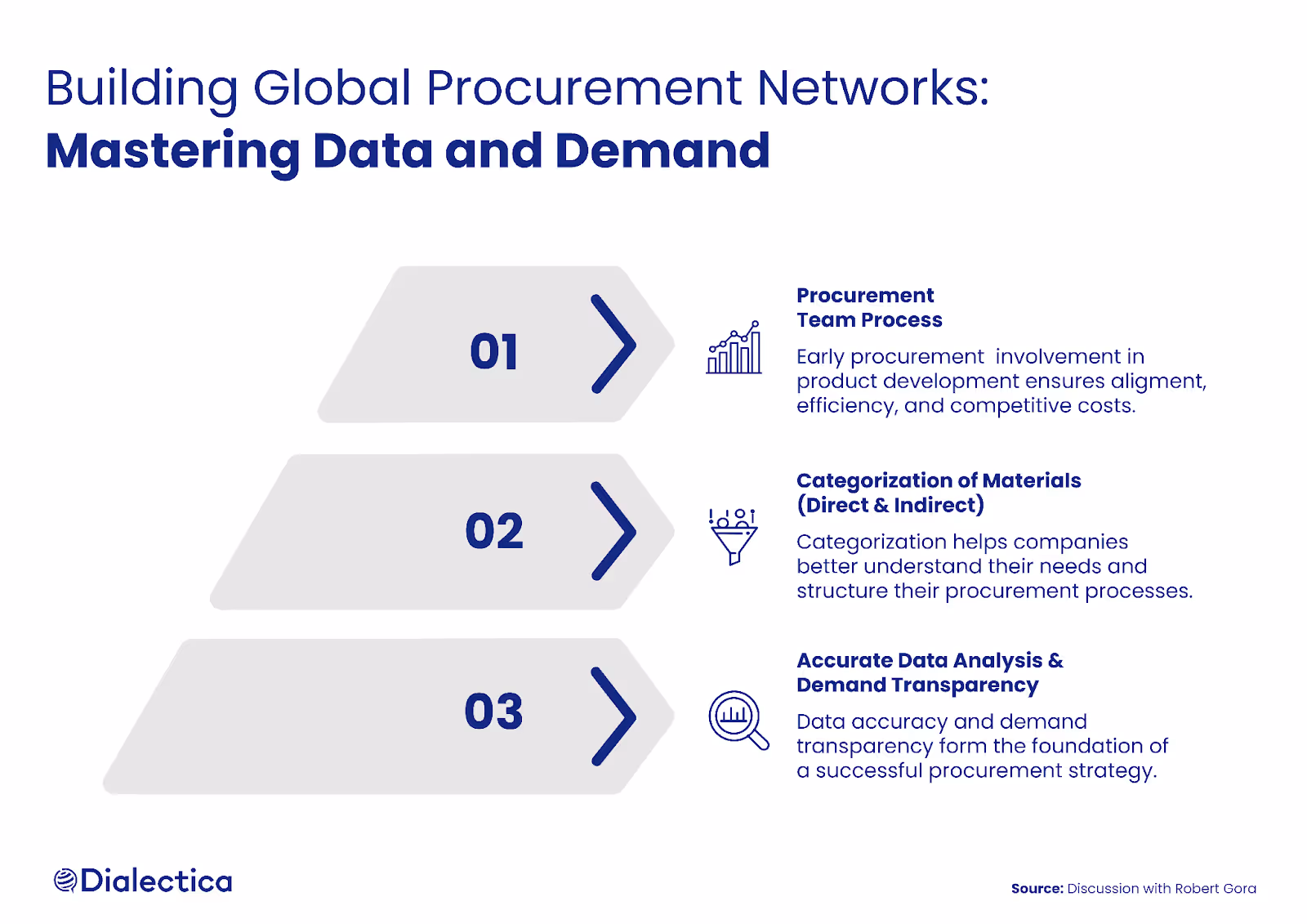 To develop a successful global procurement network, companies must first group materials based on technology and key market demands. Gora uses an example from healthcare, where specific materials like helium are critical for products like MRI machines. By focusing on these essential materials, businesses can establish relationships with suppliers and better manage their resources. This strategic approach to grouping materials and assessing demand allows organizations to optimize procurement processes, engage with suppliers more effectively, and create long-term cost savings as well as achieving a stable and robust supply chain.