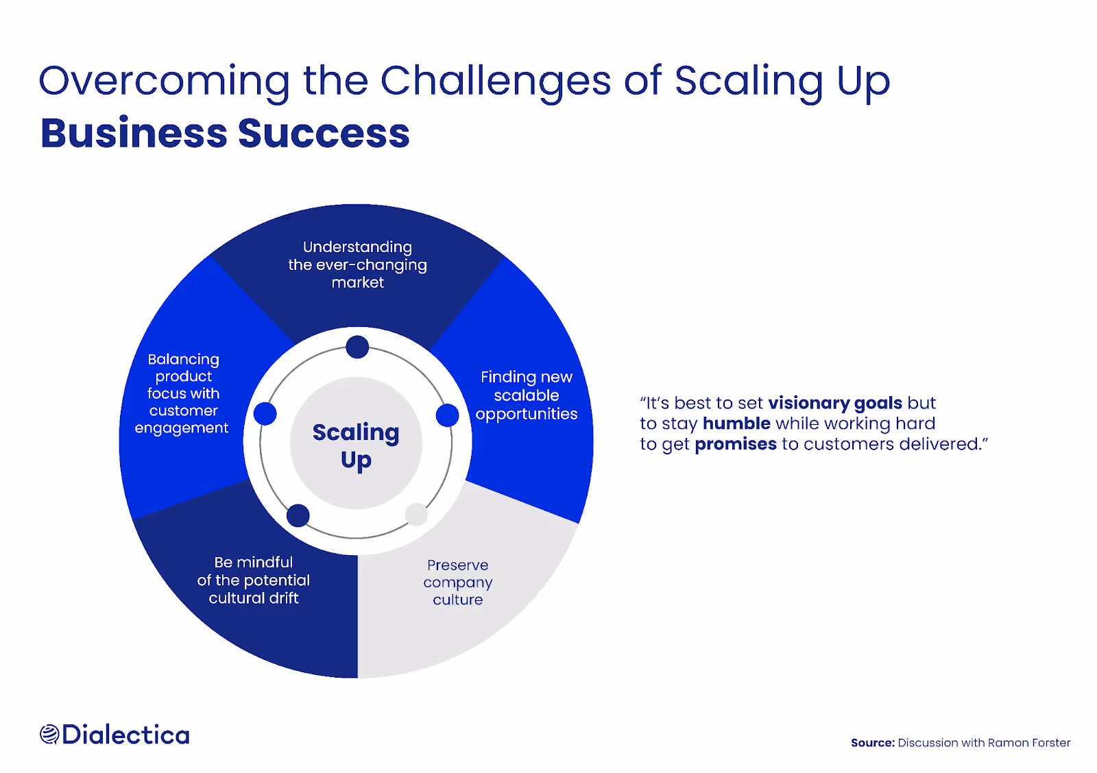 Scaling a business introduces new problems that often aren’t anticipated during the startup phase. Forster stresses the need to stay prepared for these challenges. He explains that understanding the ever-changing market and finding new scalable opportunities are key to ensuring smooth growth. “Many founders focus solely on product development and forget the importance of developing sound go-to-market strategies that need to be firmly executed, which can be a costly oversight”, he says. Forster emphasizes the necessity of balancing product focus with customer engagement to ensure that the business can “cross the chasm” on its transition to more mainstream markets, and commercial success.