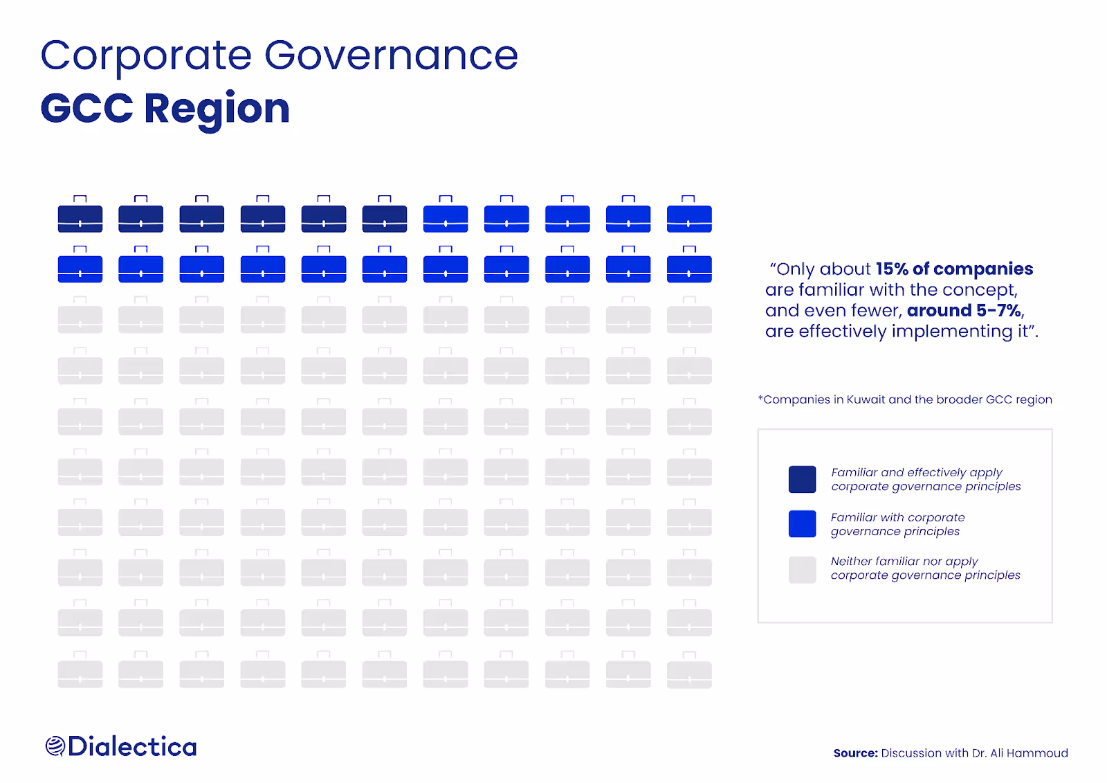 “Many companies in Kuwait and the broader GCC region are just beginning to understand and apply corporate governance principles”, notes Dr. Hammoud. He estimates that only about 15% of companies are familiar with the concept, and even fewer, around 5-7%, are effectively implementing it. This is partly due to the relatively recent introduction of formal corporate governance frameworks in the region and a cultural shift towards more structured and transparent business practices.